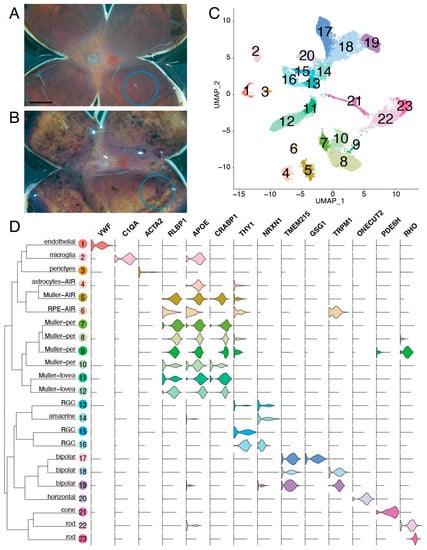 Single-cell RNA sequencing of the AIR donor. (A,B): Five human donor eyes were used for this study. A gross image of a control eye (donor 4) (A) and the AIR eye (donor 5) (B) are included. From each eye, a 2 mm foveal centered punch (red) and an 8 mm peripheral punch isolated from the inferotemporal region (blue) were acquired and gently dissociated. Scalebar (A) is 5 mm. (C): Single-cell RNA sequencing of retinal cells from the AIR donor and four control patients. A total of 23,429 cells were recovered after filtering. Unsupervised clustering of cells resulted in 23 clusters, which are visualized with uniform manifold approximation and projection (UMAP) dimensionality reduction, where each point represents the multidimensional transcriptome of a single-cell and each cluster of cells is depicted in a different color. (D): Violin plots depict the expression of cell-type specific genes across the 23 identified clusters. Per = peripheral retina. AIR = autoimmune retinopathy. RPE = retinal pigment epithelium. RGC = retinal ganglion cell.