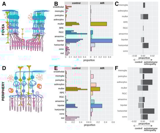 Library composition of recovered cells. (A): In the fovea, cone photoreceptor cells synapse with one bipolar cell, which synapse with one retinal ganglion cell. (B): The proportion of each cell type recovered from the fovea of the four control donors and the autoimmune retinopathy donor. No foveal rods were recovered from the AIR donor. (C): In order to visualize the degree of gene expression differences within each population of cells between the AIR and control donors, differential expression analysis was performed. In each cell type, the number of differentially expressed genes that were enriched in the AIR donor and the control donors were enumerated and divided by the total number of expressed genes (in at least 10% of cells). For example, 1.09% of foveal Müller cell genes were significantly enriched in the AIR donor (dark grey), while 0.57% of foveal Müller cell genes were significantly enriched in the control donors (light grey). (D): In the periphery, multiple rod photoreceptor cells synapse with a single bipolar cell. (E): The proportion of each cell type recovered from the periphery of the four control donors and the periphery of the AIR donor. (F): As in (C), the proportion of differentially expressed genes between the AIR and control donors was performed in each cell type. More genes were differentially expressed in the periphery compared to the fovea (C). As no RPE cells originated from control donors, differential expression could not be performed in the periphery for this cell type.