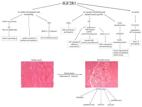 The cation-independent mannose 6-phosphate/insulin-like growth factor 2 receptor (CI-M6P/IGF2R, hereafter IGF2R) is a type-1 transmembrane glycoprotein consisting of a large N-terminal extracytoplasmic domain, which allows it to bind to a wide variety of ligands [,]. The IGF2 and M6P ligands [,,] of IGF2R have distinct but important roles in normal development and mesoderm differentiation []. Many studies have demonstrated the suppression action of IGF2R on insulin-like growth factor 1 receptor (IGF1R) signaling by scavenging extracellular IGF2 []. Furthermore, several lines of evidence demonstrate that IGF2 is highly expressed in rodent embryos, where it functions as an embryonic growth factor, while its amount is diminished at birth []. Smith et al. recently showed that a transgene-induced overexpression of IGF2 blocked programmed cell death, one of the main pathological features of cancer []. Furthermore, in some cancers such as mammary tumors, IGF2R behaves as a tumor suppressor gene [], whereas in other cancers such as cervical tumors or glioblastomas, IGF2R acts as an oncogene [,]. Thus, these two traits of IGF2R might depend on cell type. Interestingly, cervical tumors and glioblastomas have common mesenchymal founders, namely myofibroblasts [], which are also involved in muscle disease. Muscle repair is a complex and tightly regulated event that recruits different cell types, starting from macrophage and lymphocyte consecutive involvement and terminating with satellite cell (SC) activation and differentiation []. Among the common hallmarks of muscular dystrophy are the infiltration of immune cells into skeletal muscle fibers, and fibrotic cell proliferation [,,,].