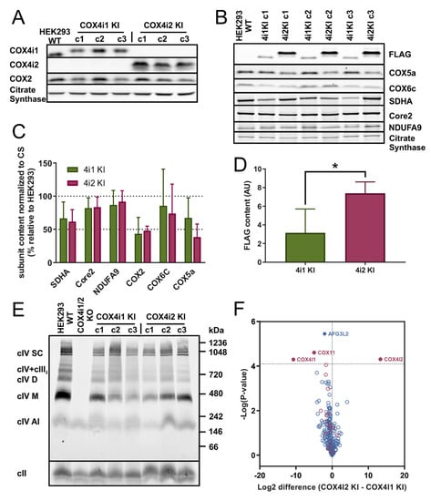 To obtain an optimal research model for unbiased comparison of functional features of COX isozymes distinguished solely by the presence of either COX4i1 or COX4i2, we constructed HEK293-based cell lines with CRISPR/Cas9 mediated knock-out of both COX4 isoforms (COX4i1/2 KO), followed by stable knock-in of either isoform. Recombinant COX4 isoforms were expressed with the C-terminal FLAG tag to facilitate isoform content comparison as well as their immunoprecipitation using the same antibody.