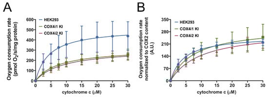 Respirometric assay of COX activity during titration of increasing concentrations of cytochrome c in mitochondrial solubilized extracts was employed to obtain maximal activity rates as well as data on the cytochrome c binding kinetics of the COX complex in 4i1 and 4i2 KI cells.