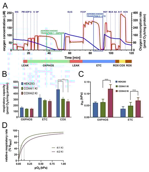 Mitochondrial respiration in permeabilised cells. (A) Representative trace of respirometric measurement. Experimental trace recorded by Oxygraph-2k (Oroboros) with 0.3 mg protein/mL of HEK293 cells from acquisition software DatLab5 showing the actual O2 concentration (blue, left Y axis in µM) and rate of oxygen consumption (red, right Y axis in pmol O2/s/mg protein). Additions of substrates and inhibitors are marked by vertical dashed lines and abbreviations above the trace (digitonin 0.05 g/g protein—DIG, pyruvate 10 mM + malate 2 mM—PM, ADP 1 mM—ADP, glutamate 10 mM—G, succinate 10 mM – S, glycerol-3 phosphate 10 mM—GP, oligomycin 0.5 µM—OLIG, FCCP 100—300 nM—FCCP, rotenone 0.5 µM—ROT, malonate 10 mM—MLN, antimycin A 0.25 µM—AA, ascorbate 2 mM + TMPD 1 mM—A+T, and KCN 0.5 mM—KCN). The diagram below is time-aligned with the experimental trace and denotes the actual respiratory state (driven by proton leak—LEAK, red; coupled to ATP synthesis—OXPHOS, green; uncoupled by protonophore FCCP—ETC, blue; residual oxygen consumption after inhibitor addition—ROX, brown; respiration with artificial substrates ascorbate and TMPD—COX, yellow). (B) Respiratory capacities in OXPHOS, ETC, and COX states are plotted as the mean ± S.D. value of seven (HEK293, blue) and twelve (four replicates of three clones each) COX4i1 (green) and COX4i2 KI (magenta) cells. *** p < 0.001. (C) Oxygen affinity expressed as p50—partial pressure of oxygen at half-maximal respiration (kPa) in OXPHOS and ETC states—is plotted as the mean ± S.D. value of seven (HEK293, blue) and twelve (four replicates of three clones each) COX4i1 (green) and COX4i2 KI (magenta) cells. *** p < 0.001. (D) Simulated hyperbolic response of relative respiratory rates (as % of maximal rates) to oxygen partial pressure (0–1 kPa) was calculated using the Michaelis-Menten function, feeding mean values of experimentally analyzed p50 values for COX4i1 (green) and COX4i2 (magenta) KI cells. Arrows projecting from respective traces towards the X-axis mark p50 values of COX4i1 and COX4i2 KI.