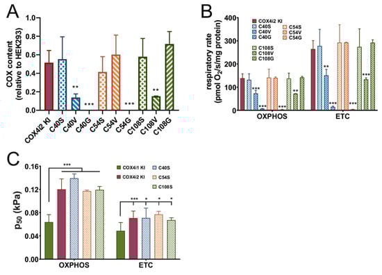 The COX content and respiration of COX4i2 cysteine substitution mutant KI cell lines. (A) The COX content calculated as the COX2 subunit quantified in the WB immunodetection experiment, normalized to citrate synthase, and expressed in % relative to the COX2 content in parental HEK293 cells, is plotted as the mean ± S.D. value of two measurements in each COX4i2 cysteine-substitution mutant KI cell line as indicated below the graph compared to wild-type COX4i2 KI (magenta, n = 9). ** p < 0.01, and *** p < 0.001 mark significant differences between individual mutant cysteine KIs and wild-type COX4i2 KI. Respiratory rates (B) and p50 (C) in OXPHOS and ETC states are plotted as the mean ± S.D. value of two measurements in each COX4i2 cysteine-substitution mutant KI cell line as indicated below the graph compared to wild-type COX4i2 KI (magenta, n = 12). * p < 0.05, ** p < 0.02, *** p < 0.001 mark significant differences between individual mutant cysteine KIs and wild-type COX4i2 KI in (B) or between COX4i1 KI and wild-type or mutant variants of COX4i2 KI cells (C).