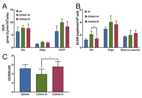 4i1 and 4i2 KI cells showed comparable values of basal OCR with glucose as a substrate (Figure 5A). The residual leak-driven respiration (oligomycin state) was similar in both KI cell lines, as well as the respiratory capacity assessed after FCCP addition (Figure 5A). Basal ECAR with glucose as a substrate showed a 1.5-fold higher value in 4i1 KI, but glycolytic capacity tested after oligomycin addition and the glycolytic reserve capacity were similar between 4i1 and 4i2 KI (Figure 5B). Finally, the OCR/ECAR ratio was calculated from rate values in the glucose state to assess cell preference for either glycolytic or mitochondrial ATP provision. This parameter was 1.4-fold higher in COX4i2 KI cells, indicating increased preference for ATP production by OXPHOS compared to COX4i1 KI cell lines (Figure 5C).