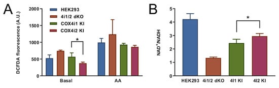 The mitochondrial respiratory chain is one of the major cellular producers of reactive oxygen species (ROS). To analyze whether the switch from COX4i1 to COX4i2 was associated with changes in oxidative stress, mitochondrial ROS production was measured in intact cells using the fluorescent probe H2-DCFDA that is sensitive to broad-spectrum ROS. Basal ROS production in intact 4i1 and 4i2 KI cell lines was compared with parental HEK293 cells and the COX4 dKO cell line. While 4i1 KI displayed similar values as HEK293 cells, 4i2 KI cells showed a 1.5-fold decreased rate of ROS production. (Figure 6A). Upon inhibition of complex III by antimycin A, which leads to reduction of the mitochondrial NADH pool, rates of ROS production increased approximately twofold (Figure 6A), but no significant differences were detected between the cell lines. These data indicate that the alterations recorded under basal conditions result from the current metabolic and redox status of mitochondria rather than increased disposition for ROS production in particular cell lines. Indeed, the ROS production rate difference between 4i1 and 4i2 KI cells correlated with values of the NAD+/NADH ratio, which was increased by 20% in 4i2 KI, indicating a less reduced NADH pool (Figure 6B). As expected, NAD+/NADH was extremely low in COX4i1/2 KO cells due to an inactive respiratory chain (Figure 6B). Unfavorable redox status correlated with increased ROS production in knockout cells (Figure 6A).