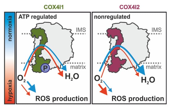 Overall, our study extends current knowledge on the regulatory role of COX4 isoforms and shows that besides affecting the ability of COX to respond to ATP levels [9,19], the COX4i2 subunit also facilitates a decrease in cytochrome c oxidase affinity to oxygen. These findings thus further characterize unique properties of the COX4i2 isoform, in accordance with the view that the COX4i2 subunit represents an important effector in regulation of COX activity and respiratory chain energetic function under hypoxic conditions. According to previously published information and novel findings of the present study, the COX4 isoform exchange regulated by oxygen availability has consequences for cellular respiration as well as mitochondrial ROS production. Activity of the energy status-regulated COX4i1 isozyme is less sensitive to hypoxia; therefore, the enzyme can operate at extremely low oxygen concentrations, limiting non-respiratory oxygen consumption. In contrast, the hypoxia-sensitive COX4i2 isozyme becomes prematurely inhibited under oxygen-limiting conditions, leading to a reduction of upstream components of the respiratory chain, promoting increased ROS production (Figure 7). Further studies are necessary to dissect the interplay of oxygen utilization, regulation of ROS production, and putative redox modification of COX4i2, as well as the role of other non-canonical COX subunits that may be involved in this remarkable physiological phenomenon of oxygen sensing.