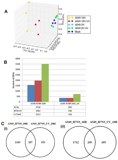 Differentially expressed genes (DEGs) in A549 cells infected with H7N9 virus. (A) Principal component analysis of the gene expression changes at 2 and 10 hours post-infection (hpi). (B) Number of up- and down-regulated genes in untreated and ultra-violet (UV)-treated virus infections. (C) Pairwise analysis of the DEGs at 10 hpi showing (i) up- and (ii) down-regulated genes in untreated and UV-treated virus infections. (D) Functional annotation of up-regulated DEGs. (E) Functional annotation of down-regulated DEGs.