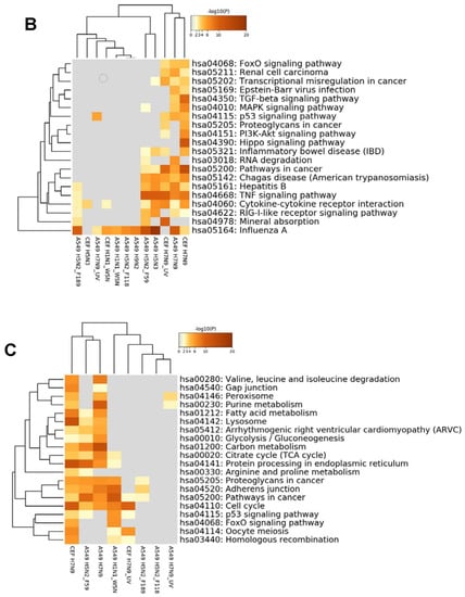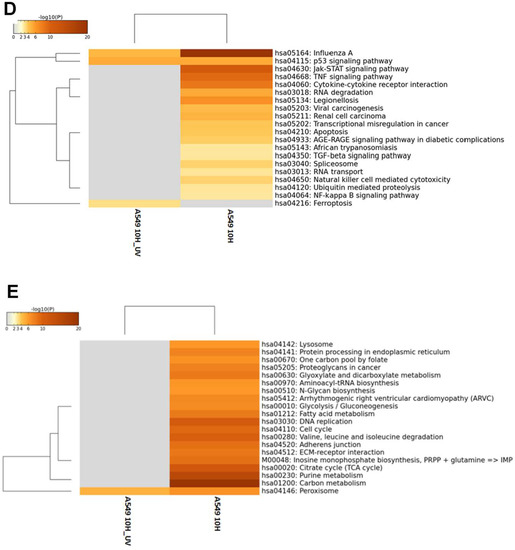 Since the 10 hpi time point displayed the most gene expression changes, the DEGs at this time point was used for functional annotation (KEGG pathway enrichment analysis). Generally, functional annotations of the DEGs relating to cell cycle, cellular organization, metabolic processes and immune response pathways were observed, and the top 20 most significant pathways are shown in Figure 2D,E and Figure S2. Pathways relating to influenza A virus and P53 signaling were the most enriched by up-regulated genes for virus infections when compared with UV-treated (Figure 2D). Other pathways, such as Janus Kinase (JAK)-STAT signaling pathway, Tumor Necrosis Factor (TNF) signaling pathway and cytokine-cytokine receptor interactions were exclusively up-regulated pathways in virus infection. Induction of these pathways suggested that they were stimulated by an active viral replication in virus-infected A549 cells. In contrast, many metabolic pathways and cell cycle processes were down-regulated during virus infections, while both virus and UV-treated infections commonly down-regulated peroxisome pathway (Figure 2E).