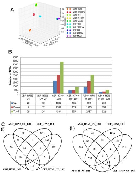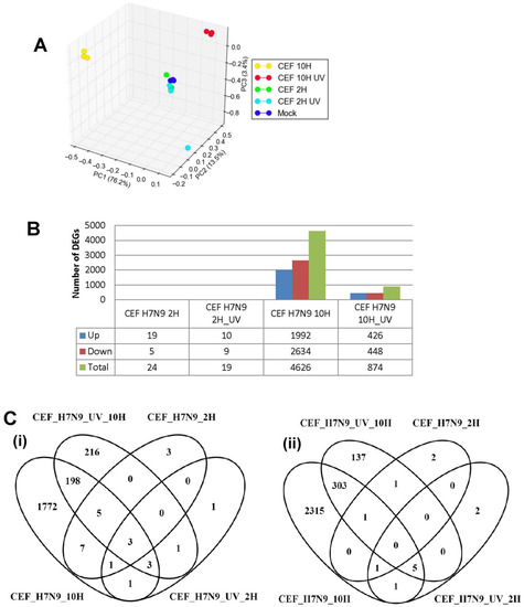 Differentially expressed genes (DEGs) in CEF cells infected with H7N9 virus. (A) Principal component analysis of the gene expression changes at 2 and 10 hours post-infection (hpi) (B) Number of up- and down-regulated genes in untreated and ultra-violet (UV)-treated virus infections. (C) Pairwise analysis of the DEGs at 10 hpi showing (i) up- and (ii) down-regulated genes in untreated and UV-treated virus infections. (D) Functional annotation of up-regulated DEGs. (E) Functional annotation of down-regulated DEGs.