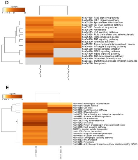The KEGG pathway analysis of the up-regulated ortholog genes showed that several pathways were shared between the virus-infected A549 and CEF cells, but their induction was displayed with different magnitude (Figure 4D). For example, at 10 hpi, influenza A and RNA degradation pathways were more prominent in virus-infected A549 cells, whereas, TGF-β signaling pathways were more prominent in virus-infected CEF cells. There were also pathways induced that were unique to each virus-infected cell type. HIPPO signaling pathway was very prominent and unique to virus-infected CEF cells. Unlike A549 cells, the UV-treated virus was also able to induce the activation of many pathways in CEF cells. Ferroptosis pathway was commonly observed in both UV-treated virus-infected cell types, while p53 signaling pathway was common to both virus and cell infections. The functional annotation of the down-regulated ortholog genes indicated that down-regulation of several metabolic pathways were an indication of active H7N9 virus replication in both cell types (Figure 4E).
