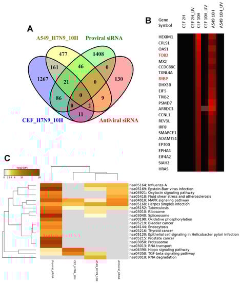Integration of proviral and antiviral host factors (genes) with the orthologous differentially expressed genes (DEGs) in A549 and CEF cells infected with H7N9 virus. (A) Pairwise analysis of the DEGs with proviral and antiviral host factors from siRNA screening studies. (B) Heat map representing 21 proviral and 2 antiviral host factors (gene symbols highlighted in red) up-regulated in both virus-infected A549 and CEF cells. (C) Functional annotation of proviral and antiviral host factors from siRNA studies in line with up-regulated DEGs in virus-infected A549 and CEF cells at 10 hpi.