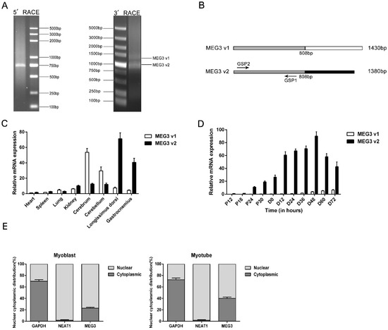 Characterization of the lncRNA MEG3 gene. (A) Results of 5′ rapid amplification of cDNA ends (RACE) and 3′ RACE of lncRNA MEG3 in porcine skeletal muscle. The arrows represent the two transcripts variants of MEG3. (B) Structure of two transcript variants (MEG3 v1 and MEG3 v2) of the porcine MEG3 gene. The grey shades mean that the two transcripts share the same front parts. GSP1 and GSP2 are the gene-specific primers for 5′ and 3′ RACE of MEG3. (C) Expression levels of the two MEG3 variants in heart, spleen, lung, kidney, cerebrum, cerebellum, longissimus dorsi and gastrocnemius. (D) Expression levels of the two MEG3 variants during porcine myoblast proliferation and differentiation. (E) The distribution of MEG3 core variant transcript (MEG3 v2) in the cytoplasm and nuclei of porcine proliferous myoblast and myotube differentiated for 48 h. NEAT1 is a known nuclear lncRNA, and GAPDH is a cytoplasmic-enriched gene. The relative RNA levels were normalized to those of the control 18S rRNA. Error bars represent mean ± SEM of three biological replicates. Statistical significance of differences was assessed by Student’s t-test. NC, negative control.