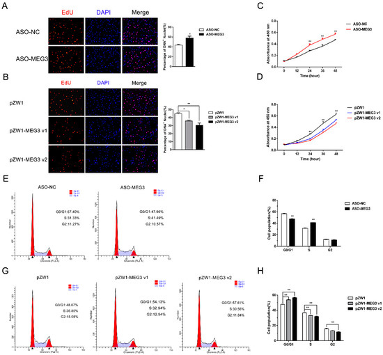 MEG3 expression levels were upregulated during the myoblast proliferation phase, indicating that MEG3 could be involved in the regulation of myoblast proliferation. In functional deficit and acquisition experiments, optimized phosphorothioate-modified antisense oligodeoxynucleotide (ASO) against the overlapping region sequence of the two MEG3 variants and pZW1-MEG3 v1 or pZW1-MEG3 v2 plasmid were respectively transfected into porcine satellite cells. In the 5-ethynyl-2′-deoxyuridine (EdU) staining assays, the interference of MEG3 with ASO showed higher mitotic activity with an increase in EdU incorporation (Figure 2A). On the contrary, the overexpression of MEG3 v1 (p < 0.05) or MEG3 v2 (p < 0.01) showed lower mitotic activity with a decrease in EdU positivity (Figure 2B). The CCK-8 assay showed that the MEG3 knockdown for 24, 36, or 48 h could dramatically accelerate cellular proliferation (Figure 2C). Inversely, the overexpression of MEG3 v1 or MEG3 v2 substantially suppressed the proliferative ability of porcine satellite cells compared with the negative control (Figure 2D). The propidium iodide flow cytometry assays indicated a considerable reduction of cell quantity in the G0/G1 phase and a remarkable increase of cell quantity in the S phase after MEG3 knockdown (Figure 2E,F). Conversely, the overexpression of MEG3 v1 or MEG3 v2 showed an opposite effect (Figure 2G,H). These findings validated that MEG3 could inhibit the proliferation of porcine satellite cells.