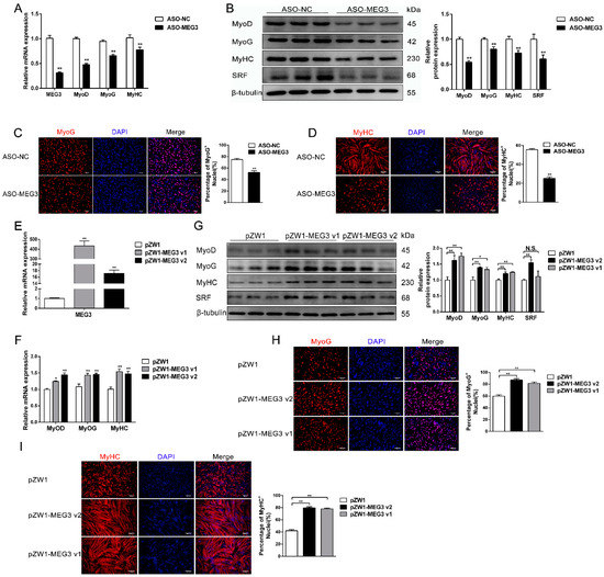 The above results demonstrated that MEG3 is extremely important for myoblasts to be able to withdraw from the cell cycle, a crucial step in myoblast differentiation. In addition, the expression profile of MEG3 prompted its association with myoblast differentiation. We used qPCR, Western blot, and immunofluorescence staining to test the changes of three established myogenic marker genes (MyoD, MyoG, and myosin heavy chain (MyHC)). qPCR results showed that MEG3 was successfully knocked down in the ASO–MEG3 group myotube differentiated for 48 h (Figure 3A). Meanwhile, the mRNA and protein levels of MyoD, MyoG, and MyHC were remarkably downregulated after MEG3 knockdown compared with the control group (Figure 3A,B). Consistently, immunofluorescence staining of MyoG and MyHC showed that MEG3 knockdown notably reduced the proportion of MyoG+ and MyHC+ cells (Figure 3C,D). To further confirm the above observation, we successfully overexpressed MEG3 v1 and MEG3 v2 in porcine satellite cells in the differentiation phase (Figure 3E). As expected, the mRNA and protein levels of MyoD, MyoG, and MyHC substantially increased after MEG3 v1 and MEG3 v2 overexpression in myotube (Figure 3F,G). Likewise, MEG3 overexpression showed that more cells proceeded with differentiation and myotube formation than the control group in the immunofluorescence staining of MyoG and MyHC (Figure 3H,I). Taken together, our results confirmed that MEG3 is required for myoblast differentiation.