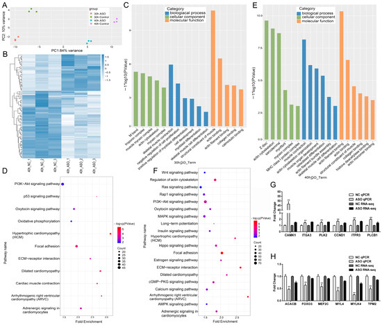 Effect of MEG3 downregulation on myogenesis transcriptome. (A) PCA analysis of four datasets (30 hNC, 30 hASO and 40 hNC, 40 hASO groups) for MEG3 knockdown. (B) Hierarchical clustering of differentially expressed genes after transfection of porcine satellite cells with ASO–MEG3 or ASO–NC and differentiation for 40 h. The color-ratio bar at the right indicates intensity of gene upregulation (blue) and downregulation (white). (C–F) GO enrichment and KEGG pathway scatterplot analysis for differentially expressed genes for cells differentiated for 30 (C,E) and 40 h (D,F). (G,H) Validation of differentially expressed genes involved in muscle development by qPCR. The y-axis indicates the fold change of RNA-Seq and qPCR. The relative mRNA levels were normalized to those of the control 18S rRNA. Error bars represent mean ± SEM of three biological replicates. Statistical significance of differences was assessed by Student’s t-test. ** p < 0.01. NC, negative control. ASO, antisense oligonucleotide. PCA, Principal component analysis. GO, Gene ontology. KEGG, Kyoto Encyclopedia of Genes and Genomes. qPCR, quantitative polymerase chain reaction.
