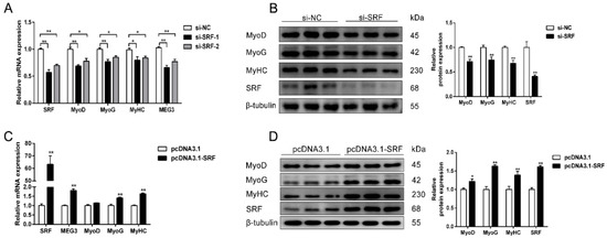 SRF promotes the differentiation of porcine satellite cells. (A) qPCR results showing that SRF knockdown significantly decreases the expression levels of MEG3, MyoD, MyoG, and MyHC in in porcine satellite cells differentiated for 48 h. (B) Western blot analysis results showing SRF knockdown significantly decreases the protein expression of SRF and the differentiation marker genes. (C,D) qPCR (C) and Western blot (D) results showing SRF overexpression significantly increases the expression levels of MEG3 and promotes porcine satellite cell differentiation. The relative mRNA levels were normalized to those of the control 18S rRNA. The relative protein levels were normalized to those of the control β-tubulin. Error bars represent mean ± SEM of three biological replicates. Statistical significance of differences was assessed by Student’s t-test. * p < 0.05, ** p < 0.01. NC, negative control. qPCR, quantitative real-time polymerase chain reaction.