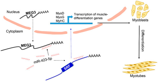 In this study, we demonstrated that MEG3 acted as a key regulator in myogenesis and revealed a novel molecular mechanism by which MEG3 regulated the miR-423-5p–SRF axis. Our results suggested that MEG3, as a ceRNA, promotes the differentiation of porcine satellite cells by sponging miR-423-5p to relieve the inhibiting effect on SRF (Figure 7).