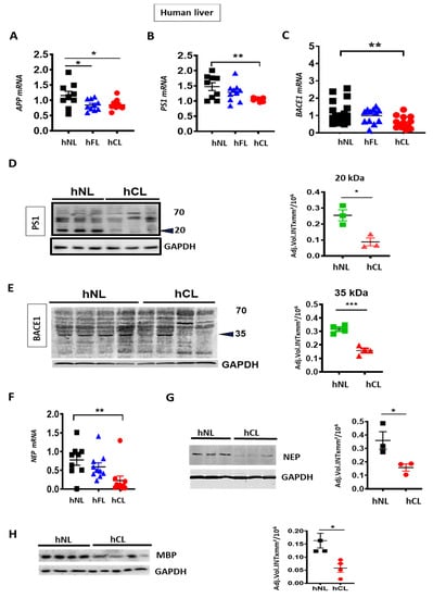 We first examined the levels of APP and the enzymes involved in Aβ generation (BACE1 and PS1) and degradation (NEP) in human fibrotic (hFL) and cirrhotic liver (hCL). APP mRNA was down-regulated (Figure 1A) in both hFL and hCL compared to normal liver (hNL), concomitant with a decrease of PS1/PSN1 and BACE1 mRNA (Figure 1B–C), reflecting an overall decrease in the key drivers of Aβ generation. Furthermore, decreased BACE1 and PS1 was confirmed at the protein level by reduced expression of the enzymatically active ~20 kDa C-terminal fragment of PS1 and of the ~35 kDa BACE1 fragment in human cirrhotic liver (Figure 1D,E). On the other hand, a significant reduction of NEP/MME mRNA and protein (Figure 1F,G) was observed in hCL vs. hNL, which indicates a minor contribution of NEP to the Aβ decrease in human cirrhosis.