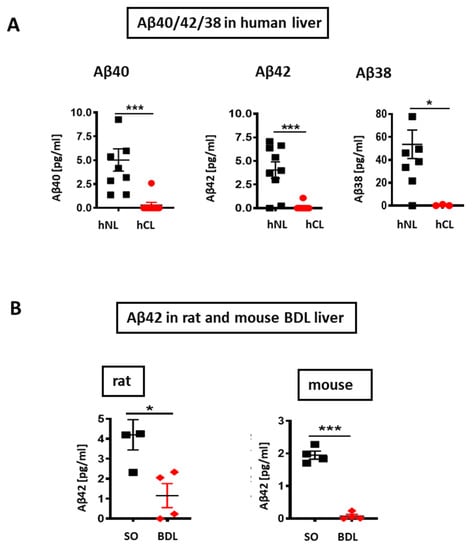 Aβ levels in cirrhotic/fibrotic and normal livers (A) V-PLEX analysis showing down-regulation of Aβ40, Aβ42, and Aβ38 in hCL vs. hNL (n = 9); (B) down-regulation of Aβ42 in rat BDL (n = 4) and in mouse BDL (n = 4) vs. respective SO livers. Mann-Whitney test in A and Student’s t-tests in B were used. Means ± SEM, * p < 0.05, *** p < 0.001.