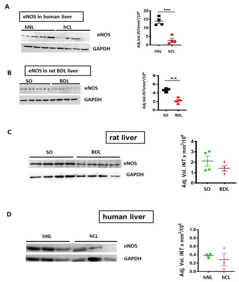 Endothelial (eNOS) and neuronal NO synthase (nNOS) in cirrhotic/fibrotic and normal livers. Western blot and densitometry of (A) eNOS in hCL vs. hNL(n = 4); (B) eNOS in rat BDL vs. sham operated (SO) controls (n = 4). (C) nNOS in rat BDL (n = 4) vs. SO (D) nNOS in hCL vs. hNL (n = 3); Student’s t-tests. Means ± SEM, ** p < 0.01, *** p < 0.001.