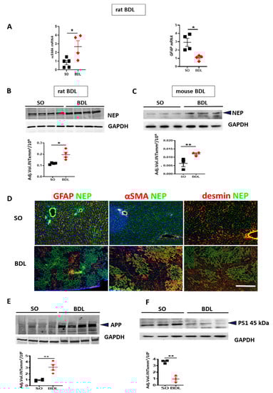 Bile duct ligation (BDL)-induced changes in proteins involved in generation and degradation of Aβ. (A) RT-qPCR of α-smooth muscle actin (α-SMA) and glial fibrillary acidic protein (GFAP) mRNA in the livers of BDL rats vs. sham operated (SO) controls. (B,C) Western blot and densitometry of neprilysin (NEP) in rat and mouse BDL livers vs. SO controls. (D) Costaining for NEP (green) and GFAP (red) (left panel), for NEP and α-SMA (red) (middle panel), for NEP and desmin (red) in (right panel) in SO (upper row) and BDL (lower row) rat liver. Cell nuclei are stained with 4′,6-Diamidin-2-phenylindol (DAPI, blue). The images are representative out of 4 animals (10 sections per animal) analyzed per group. Scale bar representative for all images in D: 200 µm. (E,F) WBs with densitometry of APP and PS1 in BDL and SO rats. Two-tailed Student’s t-tests. Means ± SEM (n = 3–6), * p < 0.05, ** p < 0.01.