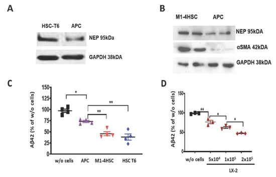 In rat BDL livers, the amount of APP was higher than in the livers of SO animals (Figure 4E). Accumulation of APP indicates its decreased cleavage by Aβ-generating enzymes. Also, downregulation of PS1 protein (Figure 4F) reflects the failure in APP processing for efficient Aβ generation. To explore the parallels in Aβ-degrading function between HSCs and astrocytes, we first assessed the expression of the Aβ-degrading enzyme NEP by astrocytes in astroglial primary culture (APC) and rodent hepatic stellate cell lines. Rat and mouse HSC cell lines (HSC-T6 and M1-4HSC) contained more NEP than APC (Figure 5A,B). A two-fold higher uptake of Aβ42 (reflected by its decrease in cell culture supernatant) by M1-4HSC and HSC-T6 vs. APC was quantified by ELISA (Figure 5C). The amount of Aβ42 internalized by human stellate cells (cell line LX-2) increased with the number of cells in culture (Figure 5D).
