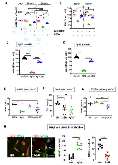 For the comparison of different cell types regarding their ability to utilize Aβ42, M1-4HSC, HSC-T6, LX-2, and astroglial primary cells (APC), as well as cell lysates from M1-4HSC, were used. All cell types were seeded onto 24-well plates at a density of 100,000 cells/well. M1-4HSC cell lysates were incubated with DMEM containing 1000 pg/mL of synthetic Aβ42 and Aβ40 in the presence or absence of 5 mM EGTA for 30 or 60 min or 1 µM LBQ657 for 48 h. Aβ42 and Aβ40 were measured with the human Aβ ELISA kit (Merck Millipore, Darmstadt, Germany) according to the manufacturer’s protocol.