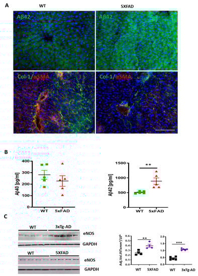 We assessed the expression of eNOS in the livers of 3×Tg-AD and 5XFAD transgenic mice, which have been previously well-characterized as models of AD [,]. In these mice, Aβ production in the brain and its systemic level were increased [,]. Immunofluorescence of Aβ42 (Figure 7A) and multiplex analysis of Aβ40 and Aβ42 (Figure 7B) displayed stronger immunoreaction of Aβ42 in liver sections and homogenates of 5XFAD compared to the wild type (WT) mice. In addition, a decrease in the expression of Col-1 and α-SMA was observed in 5XFAD mice (Figure 7A). As a reflection of Aβ’s influence on sinusoidal permeability, there were 1.6- and 2.2-fold increases in eNOS detected by WB in livers of 5XFAD and 3×Tg-AD mice, respectively, compared to corresponding age matched nontransgenic controls (Figure 7C).