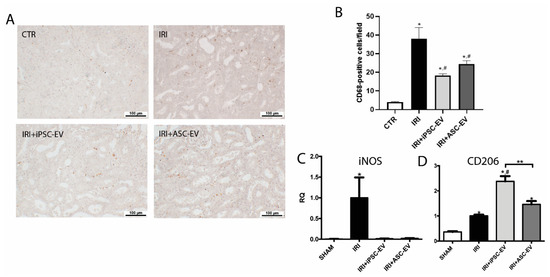 Macrophages are critical elements in the inflammatory response associated with IRI, and we aimed to see if iPSC-EV could also contribute to the reduction of macrophage infiltration (Figure 5). We analyzed the number of macrophage (ED-1-positive cells) presented in the renal tissue in the different experimental conditions (Figure 5A,B). A small number of ED-1-positive cells were identified in the kidney of SHAM group (SHAM = 4 ± 0.3 ED-1-positive cells/field), whereas IRI resulted in a noteworthy increase in the number of infiltrating macrophages (IRI = 37.9 ± 6.1 ED-1-positive cells/field). As a result of iPSC-EV administration, the number of macrophages significantly decreased (IRI+iPSC-EV = 18.3 ± 0.9 ED-1-positive cells/field). ASC-EV also led to a significant reduction in the number of infiltrated macrophages (IRI+ASC-EV = 24.4 ± 1.8 ED-1-positive cells/field). In order to understand if the macrophages accumulated in the kidney had a pro-inflammatory role, we analyzed the mRNA levels of inducible nitric oxide synthase (iNOS), expressed in M1-polarized macrophages and the mRNA levels of macrophage mannose receptor (CD206), known to be upregulated in M2-polarized macrophage. The obtained results showed that mRNA levels of iNOS presented a 200-fold increase in the renal tissue submitted to IRI with respect to SHAM condition (Figure 5C). Treatment with iPSC-EV was able to completely abrogate this increase. The ASC-EV were as efficient as iPSC-EV, resulting in mRNA levels reduced almost to the levels found in SHAM. The CD206 mRNA levels were shown to be increased in the kidney after IRI (≈3-fold increase with respect to SHAM group), and the treatment with iPSC-EV after ischemic insult led to a stronger increase (≈2.4-fold in respect to IRI) (Figure 5D). In this case, CD206 was also upregulated in ASC-EV-treated rats, but they did not show statistical differences with respect to the IRI group (≈1.4- fold increase with respect to IRI). ASC-EV were also able to reduce the mRNA levels of iNOS; however, the increase of mRNA of CD206 was not significantly different with respect to IRI (Figure 5C,D, respectively). Such results indicate that macrophages were present in the renal tissue after IRI showed a pro-inflammatory phenotype.
