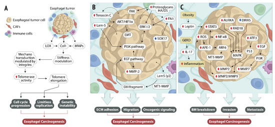 Mechanistic pathways involved in the reciprocal interactions between esophageal cancer (EC) cells and extracellular matrix (ECM). The figure illustrates the main molecules and signaling pathways altered along the interaction between tumor cells and ECM, which may represent fundamental steps for esophageal carcinogenesis. (A) Lysyl oxidase (LOX)- and matrix metalloproteinase (MMP)-altered expression in esophageal tumors is involved in the turnover of collagen molecules, resulting in ECM stiffness modulation that, in turn, may enhance telomerase activity, resulting in activation of signaling pathways involved with malignant phenotype acquisition, such as cell cycle progression, limitless replication, and genetic instability. (B) Esophageal tumor cell release increased levels of ECM adhesion molecules that activate intracellular signaling pathways involved with cell survival, enhanced cellular migration, and activation of oncogenic signaling. (C) Risk factors associated with esophageal tumor development (obesity and gastro-esophageal reflux disease—GERD) lead to an increase in leptin and interleukin 17 (IL-17) levels, which generates an inflammatory environment. The alterations in leptin and inflammation levels modulate the expression of several intracellular molecules that, together with other altered signaling pathways, converge to the activation of MMP expression and activity, entailing basement membrane (BM) breakdown, cellular invasion, and metastasis. Dotted arrows: molecules secreted by esophageal tumor cells; solid arrows: activation of cellular events or intracellular signaling pathways; red solid arrow: overexpressed molecules; solid blue arrow: underexpressed molecule.