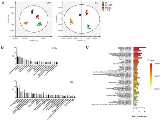 Unique changes in the metabolism of EV71-infected cells. Vero cells were infected without or with EV71 at MOIs of 0.3125, 0.625, or 1.25 for 24 h, and extracted for metabolomic analysis with UPLC-Q-TOF-MS operated in electrospray positive (ESI+) and negative (ESI-) modes (n = 9). The datasets were analyzed by OPLS-DA, and the score plots for the features obtained in ESI+ and ESI– modes are shown (A). Some of the identified metabolites with VIP scores >1.5 are shown (B). The summary plot for metabolite set enrichment analysis for EV71-infected cells (C).