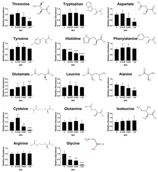EV71 infection is associated with variations in amino acid pools. Vero cells were infected and extracted for metabolomic analysis, as described in Figure 1. Features corresponding to specific amino acids were extracted. The levels of metabolites are expressed relative to those of mock-infected cells. Data are mean ± SD (n = 9). * p < 0.05, ** p < 0.01, *** p < 0.005, significant difference from mock-infected cells.
