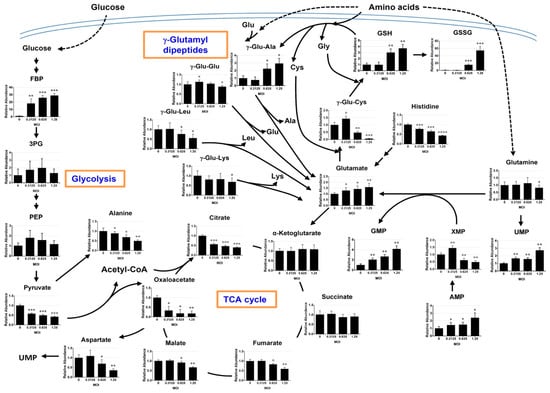 Several γ-glutamyl dipeptides, which are most likely involved in amino acid transport and glutathione metabolism [], appeared to be affected by infection (Figure 3). The levels of γ-glutamyl cysteine and γ-glutamyl leucine decreased, while that of γ-glutamyl alanine increased with MOI in the infected cells.