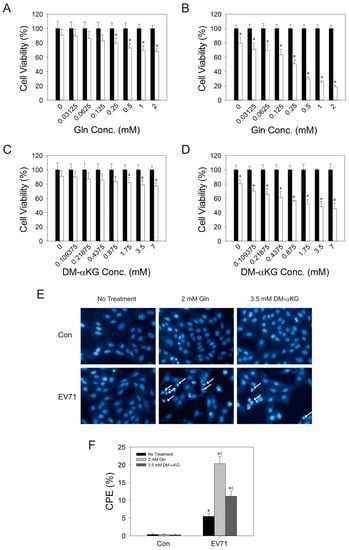 Glutamine deprivation rescues cells from viability loss and cytopathic effect. Vero cells were cultured in medium containing the indicated concentrations of glutamine (Gln) (A,B), or in glutamine-free medium supplemented with the indicated concentrations of DM-αKG (C,D). They were mock- (solid bar) or infected (empty bar) with EV71 at MOI of 1.25 for 24 (A,C) and 48 h (B,D), and the viability was assayed by neutral red assay. The data are expressed as percentage relative to those of mock-infected cells and presented as mean ± SD of six separate experiments. *p < 0.05, significant difference from mock-infected cells at a specified concentration. (E) Cells were cultured in glutamine-free medium (no treatment), medium containing 2 mM Gln, or glutamine-free medium containing 3.5 mM DM-αKG, and were mock- (Con) or infected (EV71) with EV71 for 24 h. They were stained with Hoechst 33342 and examined under a fluorescence microscope. The white arrows indicate cells with CPE. The results shown are representative of six experiments (original magnification: × 200). The cells with CPE are those characterized by chromatin condensation and formation of crescent-shaped nuclei. (F) The percentage of such cells, taken as a measure of CPE, was determined by IN Cell Analyzer 1000. Data are means ± SD of three experiments. * p < 0.01, significant difference from mock-infected cells for the indicated treatment; § p < 0.05, significant difference from the no-treatment group.