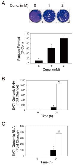 - Cheng, M.L.; Weng, S.F.; Kuo, C.H.; Ho, H.Y. Enterovirus 71 induces mitochondrial reactive oxygen species generation that is required for efficient replication. PLoS ONE 2014, 9, e113234. [Google Scholar] [CrossRef] [PubMed]
