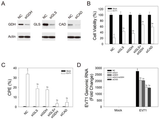 GLS, GDH, and CAD are essential to viral replication. (A) Vero cells were transfected with NC siRNA, siGDH, siGLS and siCAD, and 48 h after transfection, the cells were analyzed for expression of GDH, GLS and CAD by western blotting. An equal amount of the lysate of each transfectant was analyzed for expression of actin by western blotting. A representative result of three experiments is shown. (B–D) Vero cells were transfected with NC siRNA, siGDH, siGLS or siCAD for 48 h, and the transfected cells were mock- (solid bar) or infected (empty bar) with virus at MOI of 1.25. After 48 h, the infected cells were analyzed for cell viability (B) and the percentage of CPE (C). The cell viability data are expressed as percentage relative to those of mock-infected cells. Data are mean ± SD of six experiments. (D) Total RNA was extracted from mock- (Mock) or infected (EV71) cells for determination of viral genomic RNA. The result is expressed as fold change relative to that at 0 h p.i. Data are mean ± SD of six experiments. § p < 0.05, significant difference from mock-infected cells; * p < 0.05, significant difference from NC siRNA-transfected cells.