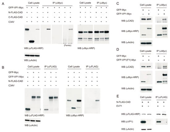 Interaction between VP1 and CAD. (A) Vero cells were transfected with the plasmid encoding GFP-VP1-Myc and that coding for N-FLAG-CAD, C-FLAG-CAD, or C34V. Forty-eight hours later, the cell lysate was prepared for immunoprecipitation with anti-c-Myc antibody (αMyc; c-Myc monoclonal antibody 9E10), and the subsequent western blotting with HRP-conjugated anti-FLAG antibody (αFLAG-HRP; MA1-91878) for detection of the co-immunoprecipitated N- or C-FLAG-CAD, or with HRP-conjugated anti-c-Myc antibody (αMyc-HRP; R951-25) for detection of GFP-VP1-Myc. (B) Reciprocal immunoprecipitation with anti-FLAG antibody (αFLAG; FLAG M2 monoclonal antibody) was followed by western blotting with αMyc-HRP for detection of the co-immunoprecipitated GFP-VP1-Myc, or with αFLAG for detection of N-FLAG-CAD. The cell lysate was immunoblotted with αFLAG-HRP, αMyc-HRP or anti-actin (αActin) antibodies. A representative result of three experiments is shown. (C,D) Vero cells were transfected with expression vector of GFP-VP1-Myc (C), GFP-VP1(FY)-Myc (D) or GFP-Myc (negative control) for 48 h, and the cell lysate was subjected to immunoprecipitation with αMyc and western blotting with anti-CAD antibody (αCAD) or with αMyc-HRP. The cell lysate was immunoblotted with αCAD, αMyc-HRP and αActin. A representative result of three experiments is shown. (E) Vero cells were transfected with the plasmid encoding N-FLAG-CAD for 48 h, and the transfected cells were infected with EV71 at MOI of 1.25 for 24 h. The cell lysate was subjected to immunoprecipitation with αFLAG and western blotting with anti-VP1 antibody (αVP1) and αFLAG. The cell lysate was immunoblotted with αVP1, αFLAG-HRP and αActin. A representative result of three experiments is shown.