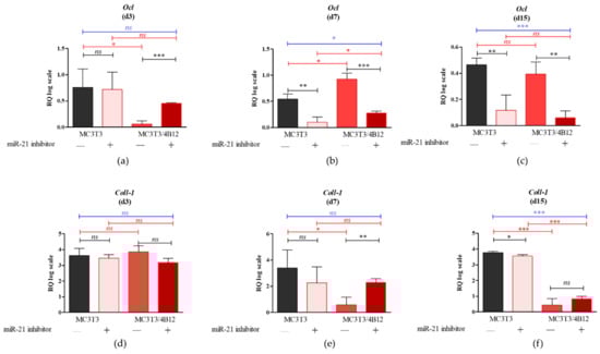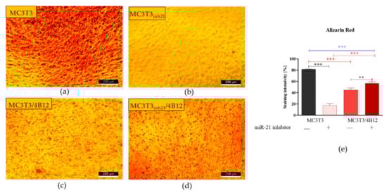 Representative images showing the results of Alizarin Red staining for calcium deposit detection. The mineralized extracellular matrix is stained with the dye. The images show an effect of miR-21 inhibition on mineralization of extracellular matrix formed by pre-osteoblast. The analysis included the determination of osteoclast precursors’ activity (co-culturing with 4B12) on MC3T3 osteogenic differentiation. Osteogenic differentiation of MC3T3 was manifested by red calcium deposits (a). The decreased mineralization was observed in cultures of MC3T3 with blocked activity of miR-21 (b). The influence of 4B12 pre-osteoclast presence during osteogenic differentiation was monitored both in co-culture with MC3T3 (c) and MC3T3inh21 (d). Images were taken under 100-fold magnification (scale bar indicated). Staining intensity was determined using ImageJ software with Pixel Counter application, as indicated in Materials and Methods section (e). Significant differences are marked using an asterisks (** p < 0.01 and *** p < 0.001), while non-significant differences are described as ns. The comparisons between groups are marked with square brackets.