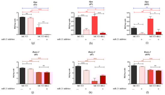 No significant differences in terms of osteocalcin (Ocl) levels were noted between MC3T3 cultures and MC3T3inh21 after 3 days of osteogenesis. However, in MC3T3 inh21 co-cultured with 4B12 we noted significant increase of Ocl transcripts following 3 days of differentiation (Figure 1a). Significantly reduced mRNA levels for Ocl, in response to miR-21 inhibition were noted after 7 and 15 days of MC3T3 differentiation, both in monolayer, as well as in the co-culture system (Figure 1b,c). Further, we determined the mRNA levels for collagen type 1 (Coll-1). Analysis revealed that inhibition of miR-21 in MC3T3 cultures do not affect the Coll-1 expression after 3 and 7 days of differentiation (Figure 1d,e). The significant decrease in mRNA levels for Coll-1, following miR-21 inhibition were noted after 15 days of culture (p < 0.05, Figure 1f). In co-culture model of MC3T3 with 4B12, inhibition of miR-21 had influence on Coll-1 levels only after 7 days of differentiation. In these cultures we observed significant (p < 0.01) increase of Coll-1 transcripts in MC3T3 inh21/4B12 cultures. The higher mRNA level for Coll-1 was also noted in MC3T3 inh21/4B12 cultures following 15 days of osteogenic differentiation, however the observed differences were not statistically significant (Figure 1d,e). The mRNA levels for osteopontin (Opn) measured in MC3T3 after 3 days of osteogenic cultures were not affected by miR-21 inhibition (Figure 1g). In turn, after 7 and 15 days of culture we observed significant decrease of Opn transcripts (Figure 1h,i). Significantly decreased mRNA levels for Opn were determined during 3, 7, and 15 days of osteogenic cultures of MC3T3 inh21 with 4B12 (Figure 1g–i). The inhibition of miR-21 significantly influenced on mRNA levels of runt-related transcription factor 2 (Runx2) in MC3T3 cell line. The decrease expression of Runx-2 following miR-21 inhibition was noted during 3, 7, and 15 days of osteogenesis (Figure 1j–l). In co-culture of MC3T3 with 4B12, the inhibition of miR-21 had no influence on Runx-2 levels after 3 and 15 days of culture (Figure 1j,l), however lowered expression of miR-21 was correlated with increased mRNA level for Runx-2, noted after 7 days of osteogenic differentiation (Figure 1k).