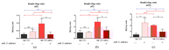 The Rankl/Opg ratio determined in experimental osteogenic cultures on days 3 (a), 7 (b), and 15 (c). Significant differences are indicated with asterisks (* p < 0.05 and *** p < 0.001), while non-significant differences are marked as ns. The comparisons between groups are marked with square brackets.