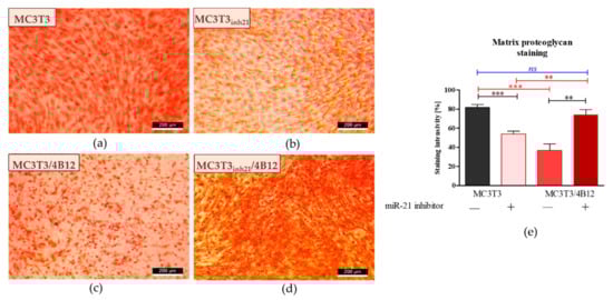 Representative images showing detection of proteoglycans with Safranin-O. The images show the effect of miR-21 inhibition on proteoglycan accumulation within the extracellular matrix formed by pre-osteoblasts under osteogenic conditions. Additionally, influence of osteoclast precursors on MC3T3 differentiation was evaluated. Osteogenic differentiation of MC3T3 was associated with increased accumulation of proteoglycans (a). The decreased content of proteoglycans was observed in cultures of MC3T3 transfected with miR-21 inhibitor (b). The influence of 4B12 pre-osteoclast presence during osteogenic differentiation of MC3T3 was monitored. The analysis revealed that osteoclasts presence decreased the accumulation of proteoglycans (c). In turn, extracellular matrix which formed in co-cultures of MC3T3inh21 with osteoclasts was rich in proteoglycans (d). Images were taken under 100-fold magnification (scale bar indicated). The staining intensity was determined using ImageJ software with Pixel Counter application, as indicated in Materials and Methods section (e). Significant differences are indicated with asterisks (** p < 0.01 and *** p < 0.001), while non-significant differences are marked as ns. The comparisons between groups are marked with square brackets.
