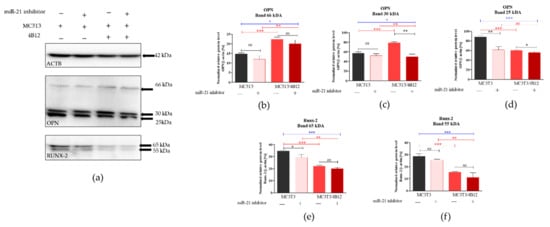 Western blot analysis was performed to determine the influence of the miR-21 inhibition on intracellular expression of OPN and RUNX-2 in pre-osteoblast maintained under osteogenic conditions. The analysis indicated the presence of three different immunoreactive bands for OPN having various molecular weight: 66 kDa resembling full-length protein, as well as 30 kDa and 24 kDa bands resulting from the full-length protein cleavage (Figure 5a). The densitometry analysis of band intensities indicated that the inhibition of miRNA-21 decreases the expression of 66 kDa OPN, however the differences were not statistically significant (Figure 5b). Furthermore, the presence of osteoclasts precursors in osteogenic cultures of MC3T3 (co-cultures) resulted in significant accumulation of 66 kDA OPN. Next, we analyzed the levels of 30 kDa OPN, and we observed that the band intensity is not altered by miR-21 inhibition for cells cultured in the monolayer system (Figure 4c). In the co-culture of MC3T3 with 4B12 we noted significant increase of 30 kDa protein. In contrast to that, we determined the significant decrease of protein in homogenates derived from MC3T3inh21 cultured with osteoclasts. The expression of 25 kDa OPN was notably increased in the osteogenic cultures of MC3T3, the protein level significantly decreased after miR-21 inhibition also in the presence of osteoclasts (Figure 5d). The expression of 65 kDa and 55 kDA RUNX-2 decreased after miR-21 inhibition (Figure 5e,f), however significant difference in terms of signal intensity was noted only for 65 kDa bands. The expression of RUNX-2 decreased in the co-culture system of MC3T3/4B12. The inhibition of miR-21 expression in MC3T3 cultured with pre-osteoclast had no effect on RUNX-2 intracellular accumulation.