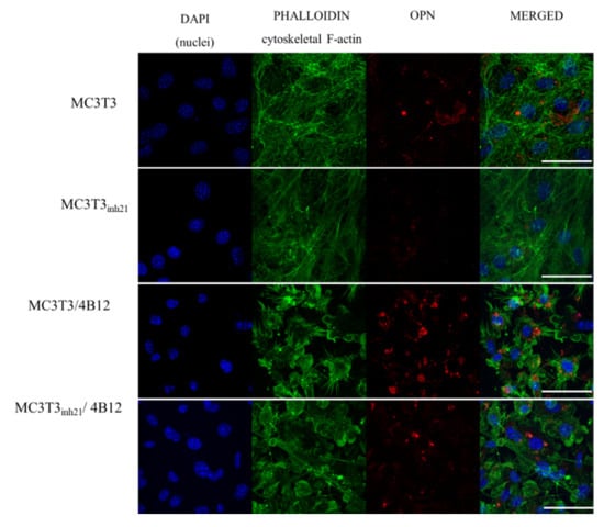 Immunocytochemistry was used to determine the OPN cellular localization (Figure 6). Images obtained with confocal microscope confirmed that OPN expression decreases after the miR-21 inhibition. Moreover, the increase of OPN expression was confirmed in MC3T3/4B12 cultures. The visualization of actin cytoskeleton indicated that under osteogenic conditions, MC3T3 are characterized by well-developed network supporting intracellular connections. The inhibition of miR-21 caused the alteration in cytoskeleton organization by weakening the architecture of actin network. In the co-culture system of MC3T3 and 4B12, the loss of intracellular connections was noted. Images obtained for MC3T3inh21/4B12 co-cultures indicated an increase in number of osteoblasts and maintenance of intracellular connections between pre-osteoblast.