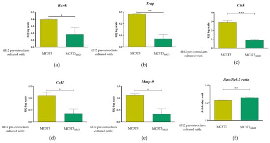 Bearing in mind the Rankl/Opg profile expression obtained for MC3T3 cultures after 15 days of osteogenesis, we were interested in an analysis of markers that are strictly characteristic for the activity of osteoclast cells, as well as for their survival. The analysis included measurement of mRNA levels for receptor activator of nuclear factor κB (Rank), tartrate-resistant acid phosphatase (Trap), cathepsin K (Ctsk), carbonic anhydrase II (CaII), and matrix metalloproteinase 9 (Mmp-9), as well as genes from B-cell lymphoma 2 family associated with apoptosis, i.e., pro-apoptotic Bax and anti-apoptotic Bcl-2. Obtained results showed significantly increased levels of transcripts for Rank, Trap, Ctsk, CaII, and Mmp-9 in 4B12 co-cultured with MC3T3 without inhibitor (Figure 7a–d) which indicates increased pre-osteoclasts activity. In contrast, the osteoclasts cultured with MC3T3inh21 expressed pro-apoptotic profile related to increased levels of mRNA for Bax and decreased for Bcl-2 (Figure 7e).