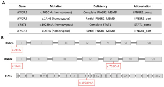 Interferon-γ (IFN-γ) is a major macrophage activating factor [19] and plays a pivotal role in the host defense machinery against mycobacterial infections. Indeed, germline mutations in the genes affecting the IFN-γ immunity can cause PIDs like for example Mendelian Susceptibility to Mycobacterial Disease (MSMD). MSMD is characterized by predisposition to disease caused by otherwise only weakly virulent mycobacterial species such as Mycobacterium bovis Bacillus Calmette–Guérin (BCG) and various environmental mycobacteria (EM). The prevalence of MSMD is estimated to be in the range of <1/1.000.000 for most etiologies according to orphanet. MSMD is usually diagnosed in childhood, and patients present mainly mycobacterial infections but can also suffer from infections with Salmonella spp, fungi, parasites, intra-macrophagic bacteria and even viruses. Of note, patients are also vulnerable to the more virulent Mycobacterium tuberculosis (Mtb) [20,21,22]. MSMD can be understood more as an umbrella term for various genotypes that share the core characteristic of susceptibility to mycobacterial disease but that can present more variable clinical and cellular phenotypes [23]. As of now, mutations in 15 genes (IFNGR1, IFNGR2, STAT1, IL12B, IL12RB1 IL12RB2, IL23R, RORC, IRF8, ISG15, TYK2, JAK1 SPPL2A, CYBB and NEMO) have been described in the context of isolated or syndromic MSMD that cause either a disruption of the production of IFN-γ or of the reaction to IFN-γ [20,23,24,25,26]. Mutations can be autosomal recessive (AR) or dominant (AD) or x-linked (XR) and can cause complete or partial functional impairment [27]. Allelic heterogeneity at several of these loci results in up to 30 different etiologies. The therapy options for MSMD patients relay mainly on antibiotic treatment and IFN-γ substitution. For severe cases of MSMD—mainly presented by patients with AR complete deficiency of the IFN-γ receptor (IFN-γ)—allogenic hematopoietic stem cell transplantation (alloHSCT) remains the only curative treatment option [23,28]. However, this approach is impeded by problems due to recurrent infections and poor engraftment caused by high IFN-γ plasma levels [29,30,31]. While HSCT is mostly necessary for AR complete IFN-γR deficiencies, there also have been two patients reported with particular forms of AR IFN-γR deficiency affecting the first initiation codon, c.2T>A for partial recessive (PR) IFNγR1 deficiency and c.1A>G for IFNγR2 deficiency, who suffered from disseminated mycobacterial infectious diseases requiring aggressive antibiotic therapy and HSCT [26,32].