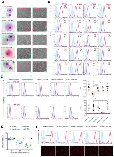 To better study IFN-γ-immunity, we subjected the different patient-derived iPSCs and the healthy control line (hCD34_iPSC16) to an already established hematopoietic differentiation protocol to generate macrophages [35]. All iPSC lines were able to form myeloid cell forming complexes (MCFCs) and started to continuously produce monocytic cells after approximately 14 days of differentiation. Cells could be harvested on a weekly basis and in similar quantities. After terminal differentiation into macrophages, cells showed typical morphology in brightfield and cytospin images (Figure 3A). Furthermore, macrophages of all patient-derived iPSCs showed a typical surface marker profile of CD45+CD11b+CD14+CD163+ (Figure 3B). We also analyzed the cells for their surface expression of IFN-γR1 and IFN-γR2 and found lower or no expression of the receptors in macrophages derived from the patients with an AR complete or partial deficiency. Of note, iIFNGR1_part macrophages showed the lowest difference of the median fluorescence intensity (ΔMFI) for IFN-γR1, while iIFNGR2_comp macrophages showed the lowest ΔMFI for the expression of IFN-γR2 on the cell surface (Figure 3C). Regardless of their mutation, all macrophages showed general macrophage functionality as shown by cytokine uptake and phagocytosis. Here, macrophages were able to uptake GM-CSF from the media (Figure 3D) and phagocytose pH-sensitive fluorescent-labeled E. coli bioparticles to a similar extent (Figure 3E). These results indicate that the patient-mutations do not influence the various IFN-γ-independent functionalities tested.