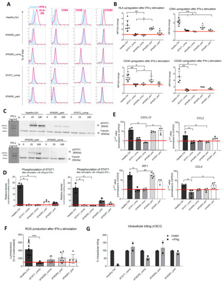 As a next step, we analyzed the consequences of the AR IFN-γR1/2 or STAT1 deficiency in fully differentiated macrophages to assess the impact on the response to IFN-γ. First, we performed flow cytometric analysis of the upregulation of common surface markers that are known to be induced by IFN-γ stimulation. Here, upon stimulation with IFN-γ, HLA-DR, CD64, CD38 and CD282 showed increased surface marker expression in healthy control macrophages, whereas no upregulation in macrophages derived from patient-specific iPSCs could be observed (Figure 4A). In addition to the initial assessment of surface marker expression, we further quantified the upregulation and analyzed the fold change of the MFI between stimulated and unstimulated samples (Figure 4B). Irrespective of the surface marker analyzed, healthy control macrophages showed the highest fold change, whereas the iIFNGR2_part macrophages showed a reduced induction. Of note, the iIFNGR1_part macrophages showed only residual induction. In clear contrast, no upregulation could be detected in iIFNGR2_comp and iSTAT1_comp macrophages, suggesting an impaired downstream signaling pathway. Moreover, the stimulation with IFN-γ itself did not have any negative effect on cell viability (Figure S1E). To underline this observation, we next analyzed the phosphorylation of STAT1 as a major downstream effector molecule of the IFN-γR pathway. Healthy control macrophages phosphorylated STAT1 after stimulation with a low (25 ng/mL) and high (100 ng/mL) dose of IFN-γ. In contrast, both the iIFNGR1_part and iIFNGR2_part macrophages showed a clear phosphorylation but to a much lesser degree, while no phosphorylation could be detected for the iSTAT1_comp and iIFNGR2_comp macrophages (Figure 4C). In line with these observations, densitometric analysis also showed that the macrophages with the partial deficiency showed a phosphorylation that is much lower than the healthy control macrophages (Figure 4D). Of note, iSTAT1_comp cells showed no expression of STAT1 as expected, whereas the other lines showed normal STAT1 expression (Figure S1C). To further asses the impaired IFN-γR response, we also analyzed the upregulation of downstream target genes of the IFN-γ immunity. Here, CXCL10 and IRF1 showed a clear upregulation in healthy control macrophages after IFN-γ stimulation, but also macrophages with a partial deficiency showed a similar upregulation, whereas the AR complete IFN-γR2 and STAT1 deficiencies showed no upregulation. For CCL2 and CCL4 healthy control macrophages showed a slight upregulation, as well as the iIFNGR2_part macrophages, whereas the other cells showed no induction (Figure 4E). While IFN-γ is involved in the activation of macrophages and pathogen clearance, we further assessed the functionality of macrophages after IFN-γ stimulation in the context of reactive oxygen species (ROS) production. Similar to the assays before, healthy macrophages showed a strong ROS production post IFN-γ stimulation, while iIFNGR2_part macrophages showed only a slight ROS production. A slight ROS production could however also be observed in iIFNGR1_part and iIFNGR2_comp macrophages and only iSTAT1_comp macrophages showed no production (Figure 4F). As a final functional assessment of patient specific iPSC, we challenged iPSC-derived macrophages with Mycobacterium bovis Bacillus Calmette–Guérin (BCG) as an MSMD-relevant pathogen. Following co-culture experiments with BCG, we could observe a reduced growth of BCG for the healthy control macrophages, whereas no to little clearance of BCG was observed for macrophages derived from the various patient specific iPSCs lines (Figure 4G).