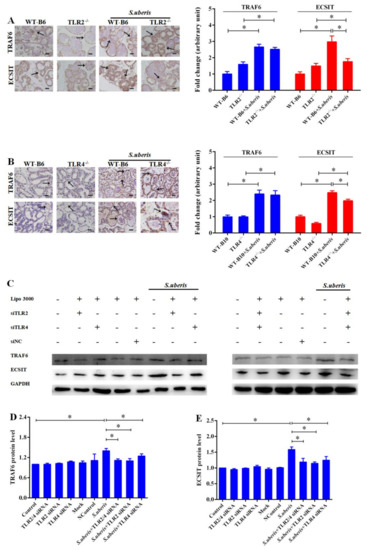 We next evaluated the expression levels of TRAF6 and evolutionarily conserved signaling intermediate in Toll pathways (ECSIT) which are downstream targets of the MyD88 signaling pathway, using immunohistochemistry in mammary glands of mice. The TRAF6 adaptors increased dramatically in all mice after S. uberis infection (p < 0.05), although TLR2 or TLR4 deletion weakened the expression of ECSIT compared with WT mice during S. uberis challenge (p < 0.05; Figure 4A,B). Similarly, in MECs, interfering TLR2 or TLR4 significantly reduced the expressions of TRAF6 and ECSIT after S. uberis infection (p < 0.05; Figure 4C–E). Interestingly, there is no significant difference between TLR2−/− and TLR4−/− mice in the expressions of TRAF6 and ECSIT during S. uberis infection. These results confirmed that TRAF6 and ECSIT downstream of the MYD88 pathway mediated the anti-S. uberis response in mice and in MECs.