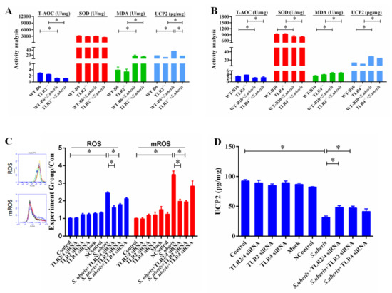 TRAF6 activated by TLRs transfers from cytoplasm to mitochondria, where it engages ECSIT to produce mROS inducing cellular anti-bacterial responses [28]. Since the level of ROS in tissue cannot be detected well, we analyzed total antioxidant capacity (T-AOC), superoxide dismutase (SOD), malondialdehyde (MDA), and uncoupling protein 2 (UCP2) in mammary glands to indirectly reflect the antioxidant levels. The levels of MDA and UCP2 were significantly increased due to the infection of S. uberis in WT, TLR2−/−, and TLR4−/− mice (p < 0.05; Figure 5A,B). Although there was no obvious distinction between MDA (p > 0.05), the absence of TLR2 further reduced UCP2 (p < 0.05). The level of T-AOC was significantly lower in all groups after S. uberis challenge compared with control accordingly (p < 0.05). Deletion of TLR4 rather than TLR2 significantly decreased SOD activity after S. uberis infections (p < 0.05). These results indicated that the host’s oxidation level did change after S. uberis infection and these changes were related to the TLRs signaling pathway.