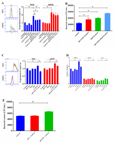 GKT137831, a specific inhibitor of NADPH oxidase 1 (NOX1) and NOX4, and NG25, an inhibitor of TAK1 [29,30], were used to suppress ROS generation from NOX complexes and down-regulate the production of proinflammatory cytokines respectively. GKT137831 and NG25, simultaneously or separately, reduced the generation of ROS after challenge with S. uberis but cannot change the level of mROS (p < 0.05; Figure 6A). The bacterial counts of S. uberis in MECs were significantly higher in the inhibitor-treated groups (p < 0.05) (Figure 6B). In addition, we measured the levels of cytokines and obtained similar results (Figure S3). We inhibited the production of mROS by siECSIT to establish mROS role in regulating inflammation and anti-S. uberis activity. ROS and mROS levels decreased significantly after using siECSIT (p < 0.05; Figure 6C). Similar results were observed at TNF-α, IL-1β, and IL-6 expressions: their levels were up-regulated after S. uberis infection but siECSIT can reduce their expressions (Figure 6D). Meanwhile, the bacterial counts of S. uberis in MECs were significantly higher in the siECSIT treatment group (Figure 6E). These results demonstrated that mROS does play an important role against S. uberis infection in MECs.